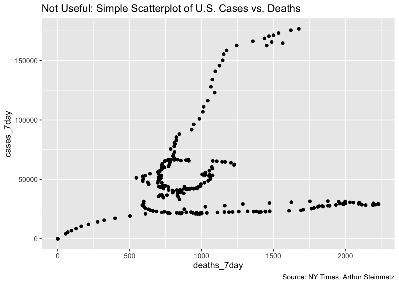 We might be tempted to simply plot deaths vs. cases but a scatter plot shows us that would not be satisfactory. As it turns out, the relationship of cases and deaths is strongly conditioned on date. This reflects the declining mortality rate as we have come to better understand the disease.