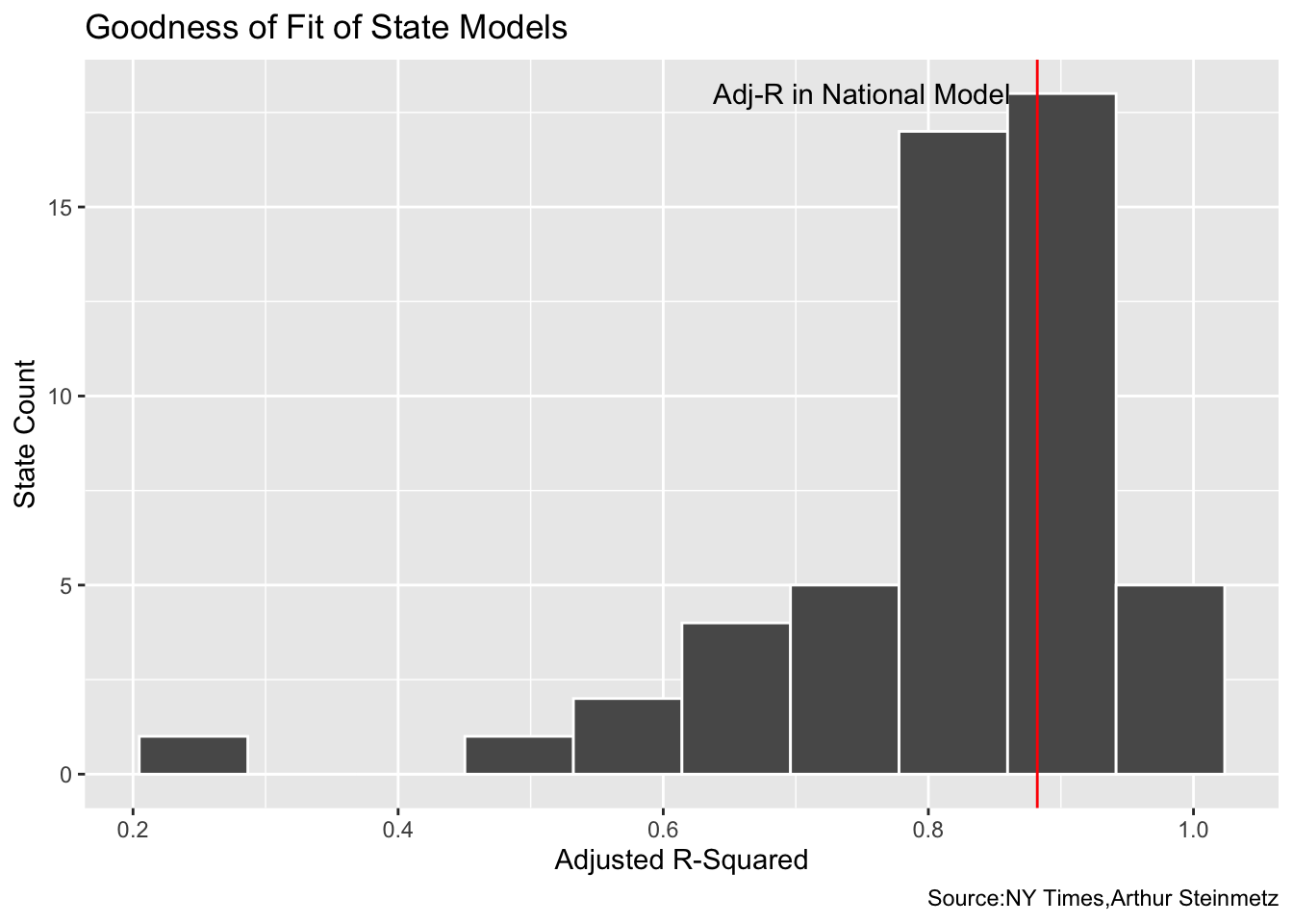 I have been thinking about how to measure mortality lags for a while now. What prompted to do a write-up was discovering a new function in Matt Dancho’s timetk package, tk_augment_lags, which makes short work of building multiple lags. Not too long ago, managing models for multiple lags and multiple states would have been a bit messy. The emerging tidymodels framework from RStudio using list columns is immensely powerful for this sort of thing. It’s great to reduce so much analysis into so few lines of code.