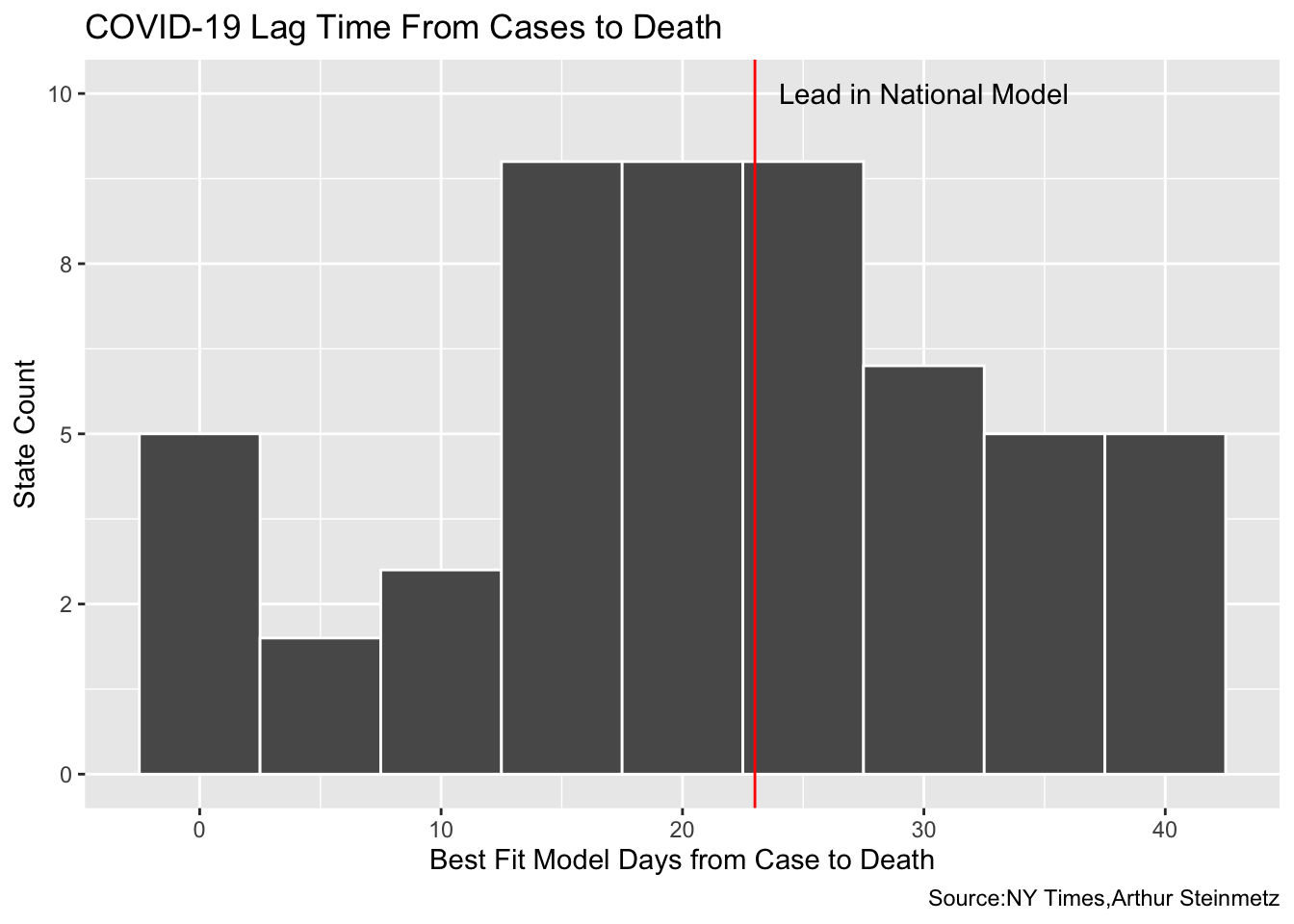 The purpose of this project is, as usual, twofold. First, to explore an interesting data science question and, second, to explore some techniques and packages in the R universe. We will be looking at the relationship of COVID-19 cases to mortality. What is the lag between a positive case and a death? How does that vary among states? How has it varied as the pandemic has progressed? This is an interesting project because is combines elements of time series forecasting and dependent variable prediction.