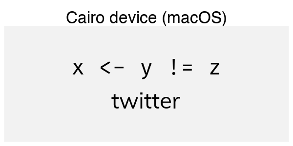 The Cairo device on Linux handles this task well, as we have noted above. How come this works, but only on one OS? Cairo is built in to most Linux distributions and is designed to work with Pango, the library that linux uses to layout text. R’s Cairo graphics device bundles Cairo on all platforms, but doesn’t include Pango, due to the challenges of building it on other operating systems.