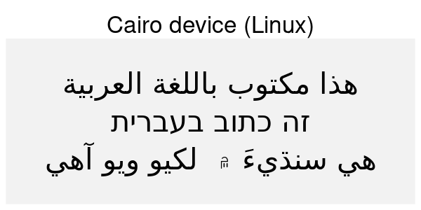 If you’re not familiar with the languages above it can be hard to see what is right and what is wrong. You may, however, look at how the text in the code is rendered in the browser and compare that to the device rendering. If you do that, you can see that the Hebrew script is rendered in the wrong direction for all the non-ragg devices (except Cairo on Linux). For the Arabic and Sindhi it’s even harder to see what’s wrong because the text looks fundamentally different. That’s because both Arabic and Sindhi rely extensively on text substitution rules and ligatures; the way a letter is written depends critically on what letters it is next to. Still, by comparing to the browser rendering you can see that the same devices failing on the Hebrew script fail here as well.