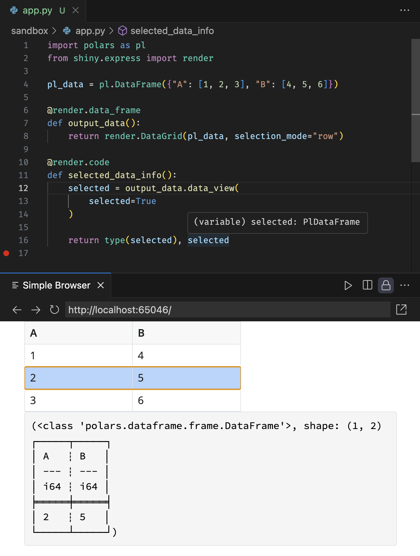 Both DataGrid() and DataTable() now support Polars DataFrames in addition to pandas DataFrames. Also, accessor methods like .data() and .data_view() now return the same type as the rendered data. This even works with type hints, meaning your IDE will know the correct return type of the accessor. See the screenshot below for an example, and note the polars type hint in the tooltip.