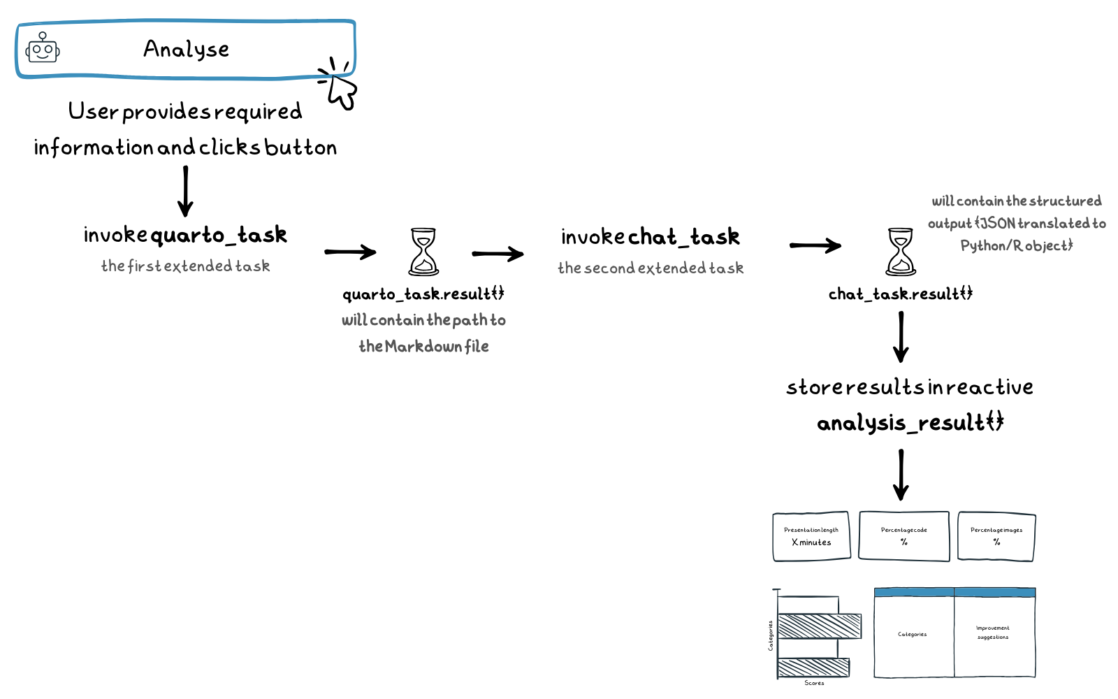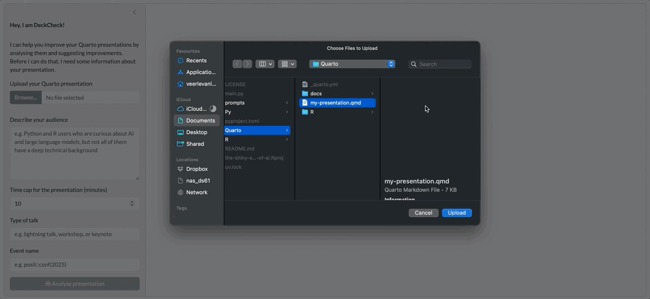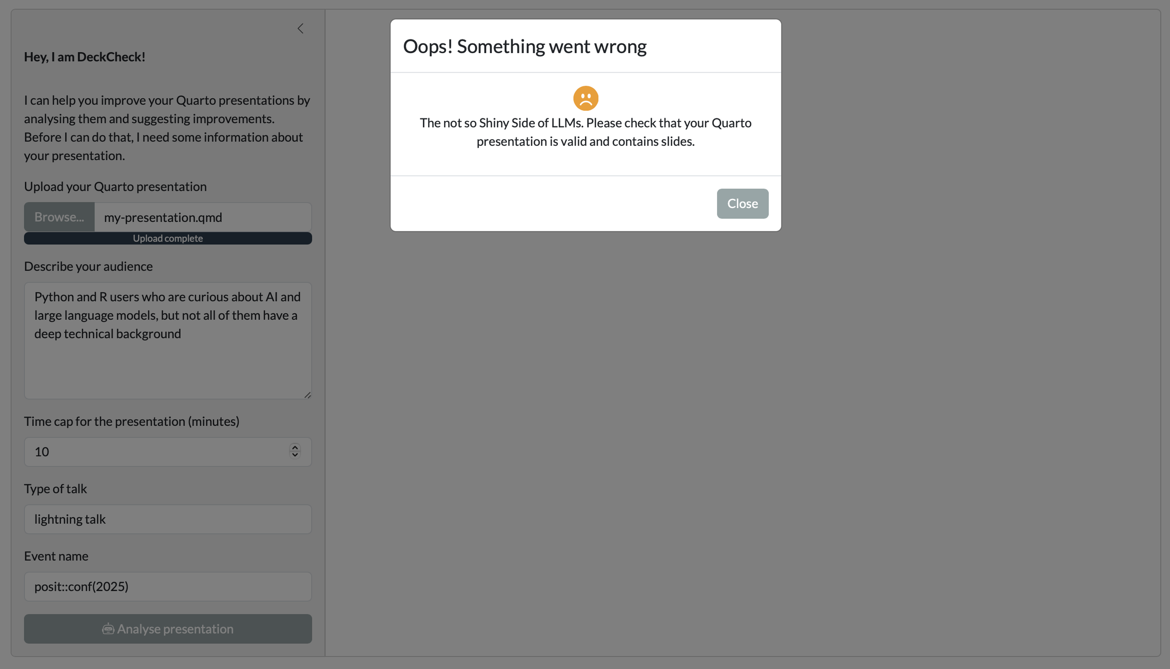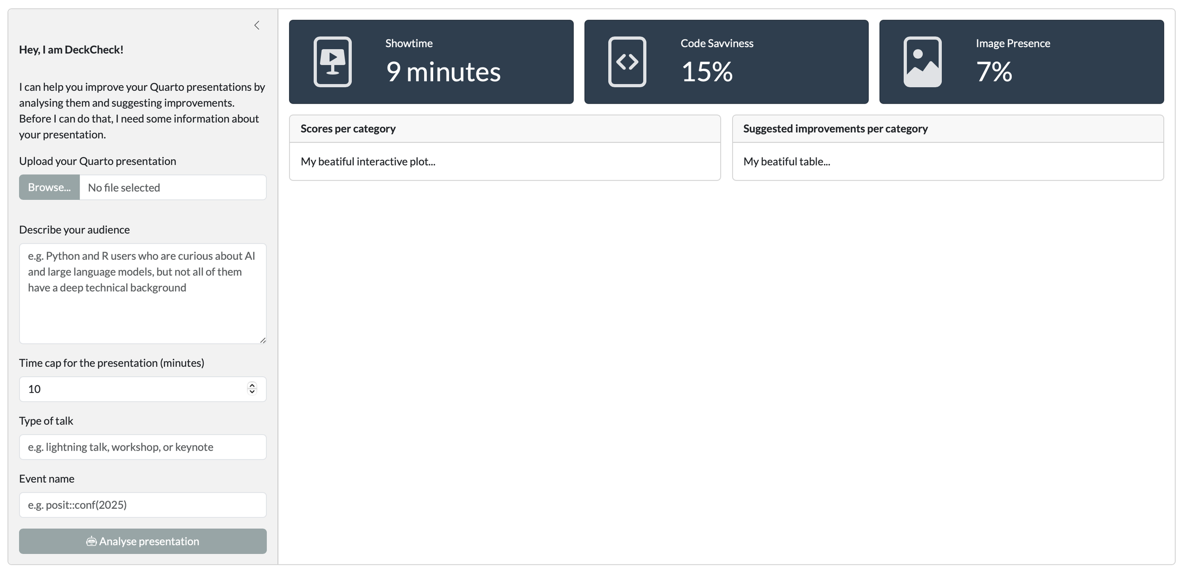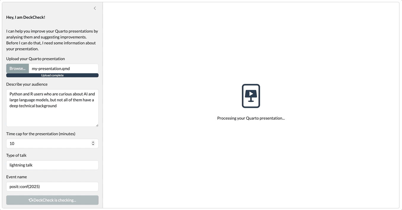 This part of “The Shiny Side of LLMs” series will build an app called “DeckCheck”: a genius app that gets rid of lengthy unfocused presentations, like a perfect “Presentation Rehearsal Buddy”. The goal: let users upload their Quarto presentation and provide them with feedback on how to make it better.