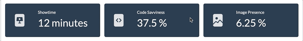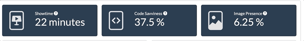 "Code Saviness is calculated based on the slides that contain code chunks. The percentage is the ratio of those slides to total slides."
