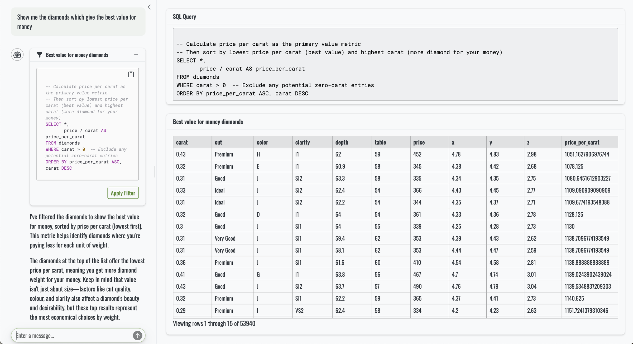 Things get more interesting when we introduce a calculation. Asking “can you show the 20 biggest diamonds, based on volume?” still results in simple SQL, but the output now includes an extra column, volume, which appears neatly in the app.