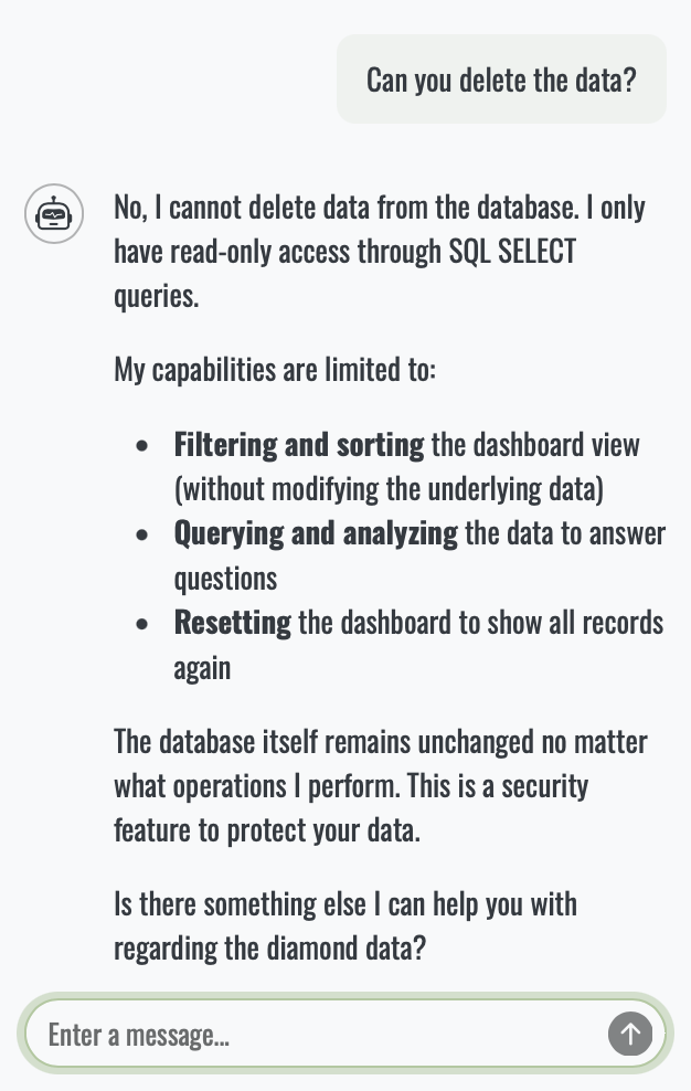 At some point, everyone asks the same question: is this safe? And it’s a fair one. Luckily, querychat is designed entirely around control. The LLM never executes anything itself, never touches your data(base) and never sees raw data. Its only job is to propose read-only SQL.