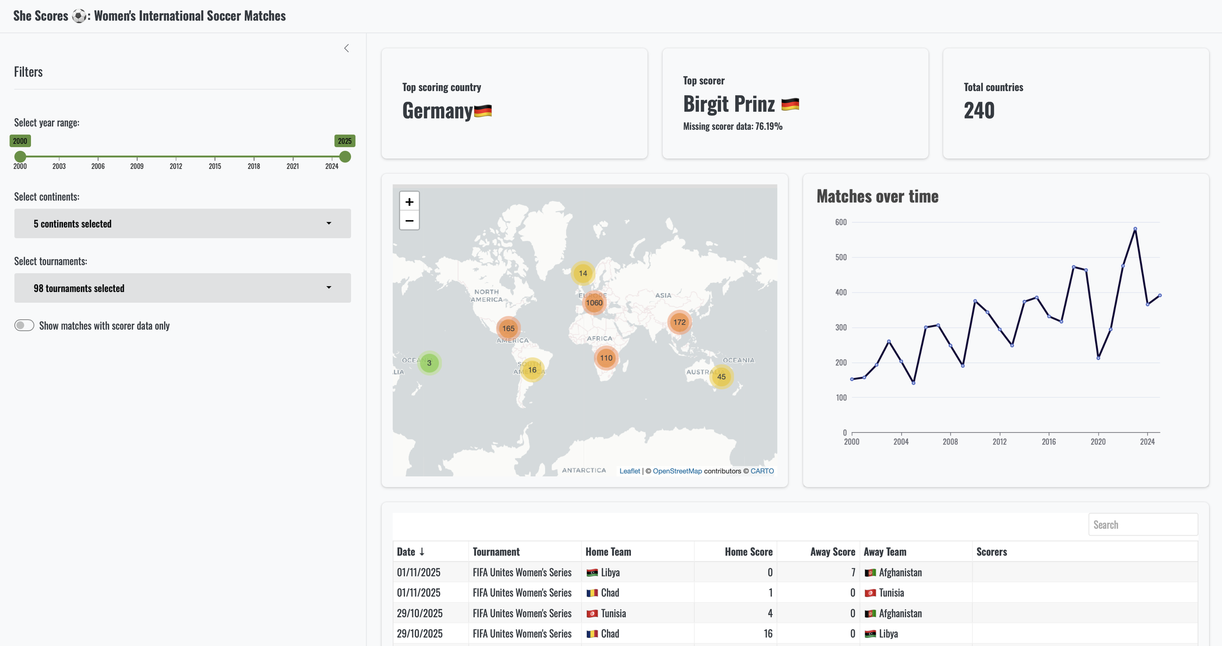 • SheScores, the soccer dashboard that you were so proud of earlier. This app originates from the shiny::conf(2024) workshop  “Shiny 101: The Modular App Blueprint” , although it has been tweaked to make it a bit more interesting and updated with matches through to November 2025.